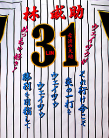 阪神タイガースグッズと刺繍「イエロー・ユニ」の携帯用バナー