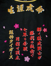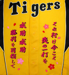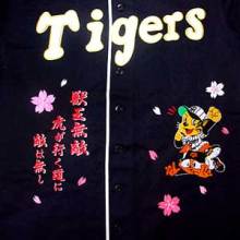 阪神タイガースグッズと刺繍「イエロー・ユニ」の携帯用バナー
