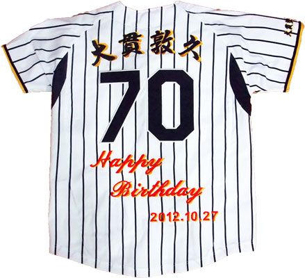 還暦・古希・長寿祝い・銀婚式・金婚式の大切な記念日に、阪神タイガース刺繍をユニフォームにオリジナルメッセージを刺繍で演出いたします。プレゼントにイエローユニのサプライズ刺繍とても大好評で、全国からお祝い刺繍、ご注文いただいております。刺繍工場直販ですので、迅速に対応できます。ご相談お問合せお待ちしております。