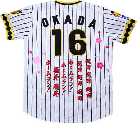 イエローユニの阪神タイガース お客様刺繍制作オーダー見本は、他店でよくある「アイロン貼り付け」ではなく、全て刺繍です。 2色文字影書体の刺繍の色は、赤文字/黒影、赤文字/黄影、黄文字/黒影、黄文字/赤影、黒文字/白影、赤文字/白影、濃ピンク文字/黄影など、ユニフォームに応じて、アドバイス致します。